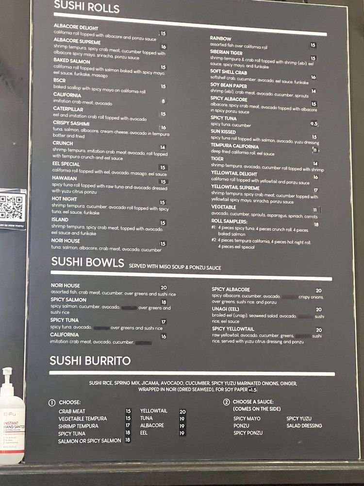 Inside: Albacore, spicy imitation crab meat, avocado Top: albacore Sauce: spicy ponzu sauce, furikake (sesame seasoning)