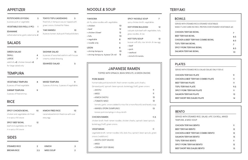 Korean style beef short ribs. Bento boxes come with steamed rice, salad, mixed tempura ( shrimp, vegetable), pc California Roll, and miso soup.