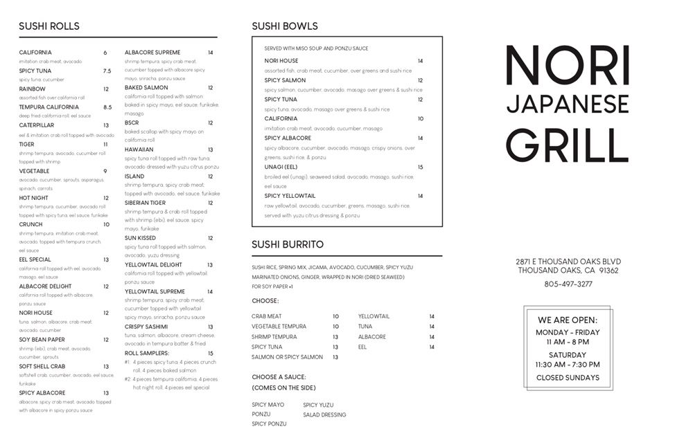 Introducing Nori Japanese Grill, a hidden gem offering fresh and delicious Korean-Japanese cuisine in Thousand Oaks, CA. Known for accommodating any preference, from mild to spicy, their extensive menu includes options for pescatarians, vegans, and vegetarians. With a cozy atmosphere and excellent service, Nori is perfect for a casual lunch or dinner. Customers rave about their fresh veggies, flavorful noodles, and standout dishes like Yaki Soba and salmon nigiri. Whether you're in the mood for sushi, ramen, or a bento box, Nori Japanese Grill is a must-try for Japanese food enthusiasts. Be sure to try their spicy pork teriyaki and experience the outstanding quality and taste that sets Nori apart as a top choice for a healthy and delicious meal. Remember to bring your own container for leftovers, as this eco-friendly restaurant offers compostable containers. Don't miss out on this little hole-in-the-wall spot where each bite is a true delight.