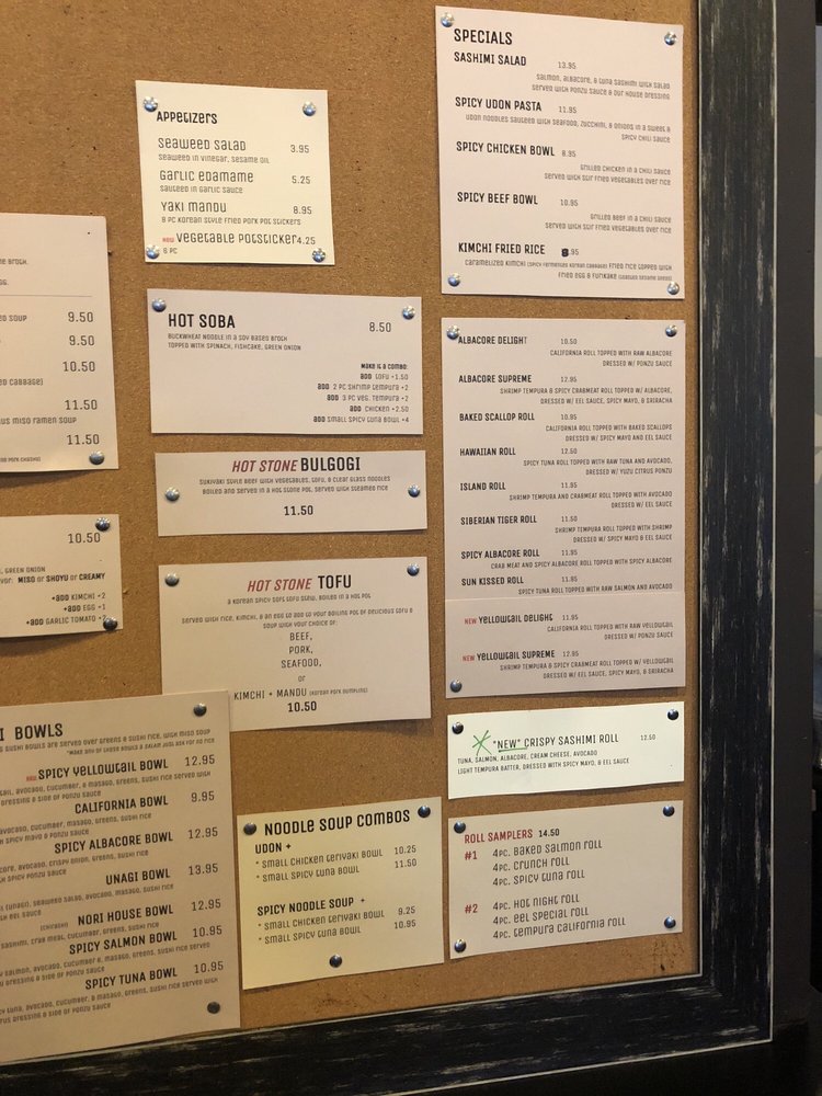Inside: shrimp tempura, spicy imitation crab meat, cucumber Top: Yellowtail Sauce: spicy mayo, sriracha, & ponzu sauce.